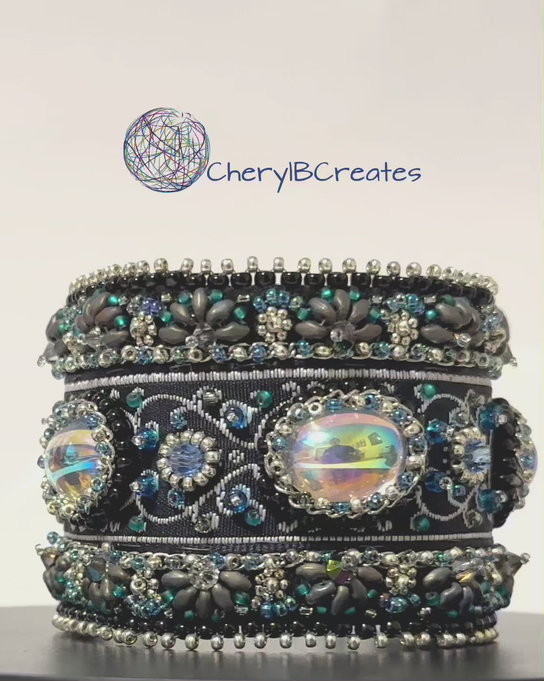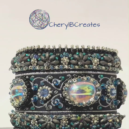 Built on bold Jacquard ribbon, this bracelet fearlessly combines seed beads, crystals, and acrylic cabochons into a bold, textured composition that demands attention.