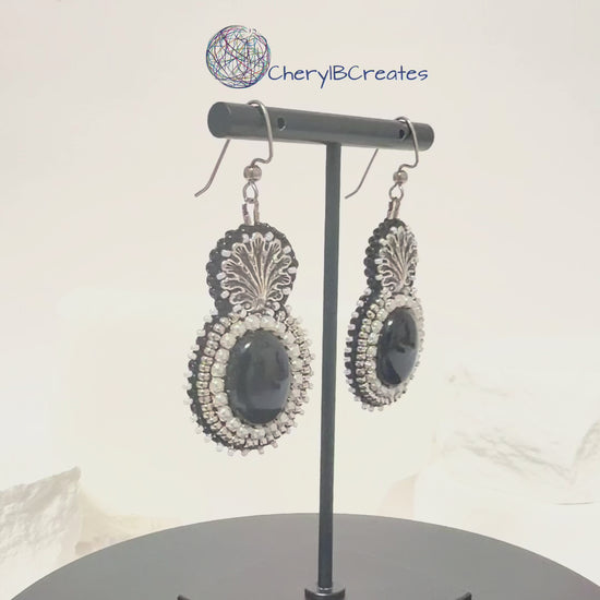 These handmade earrings bring together classic black onyx with light, beach inspired details. A black onyx cabochon sits at the center, framed by white pearl cup chain that adds a soft glow and a touch of contrast. A metal shell placed above the stone finishes the design with a subtle nod to summer and the sea.