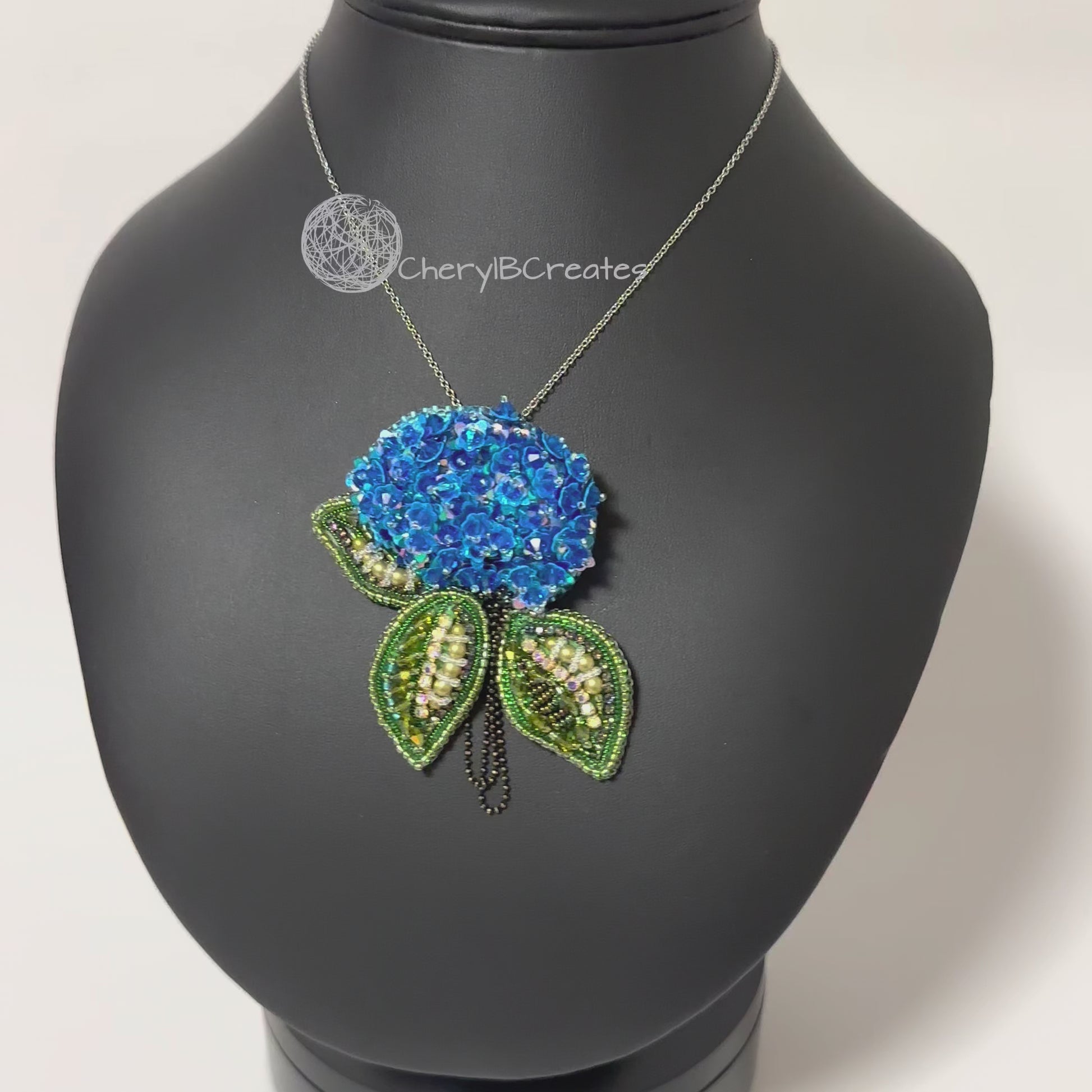 Sequins, crystals and beads come together to create a beaded hydrangea that can be worn either as a pendant or as a brooch. The flower is created from shimmering sequins, sparkling crystals, and beads. It has an elevated base to give it the depth of a real flower.