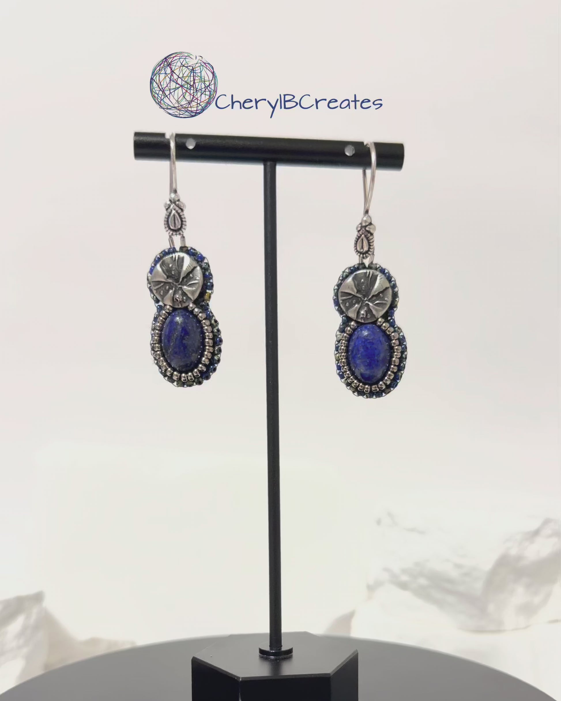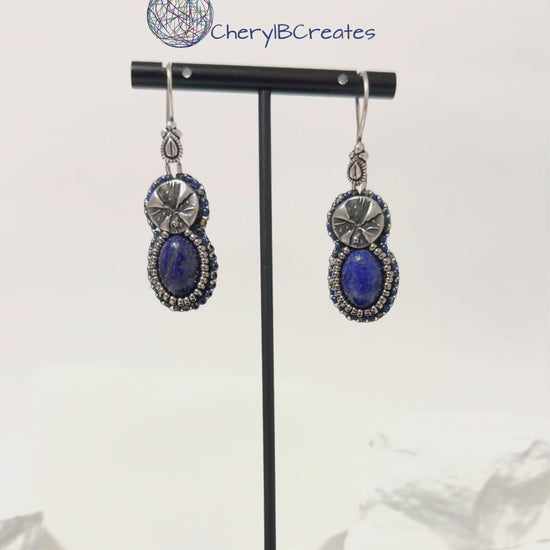 These hand beaded earrings highlight the rich blue tones of a small lapis lazuli cabochon. The stone is paired with an antique silver charm that adds a simple decorative touch and complements the deep color of the lapis.