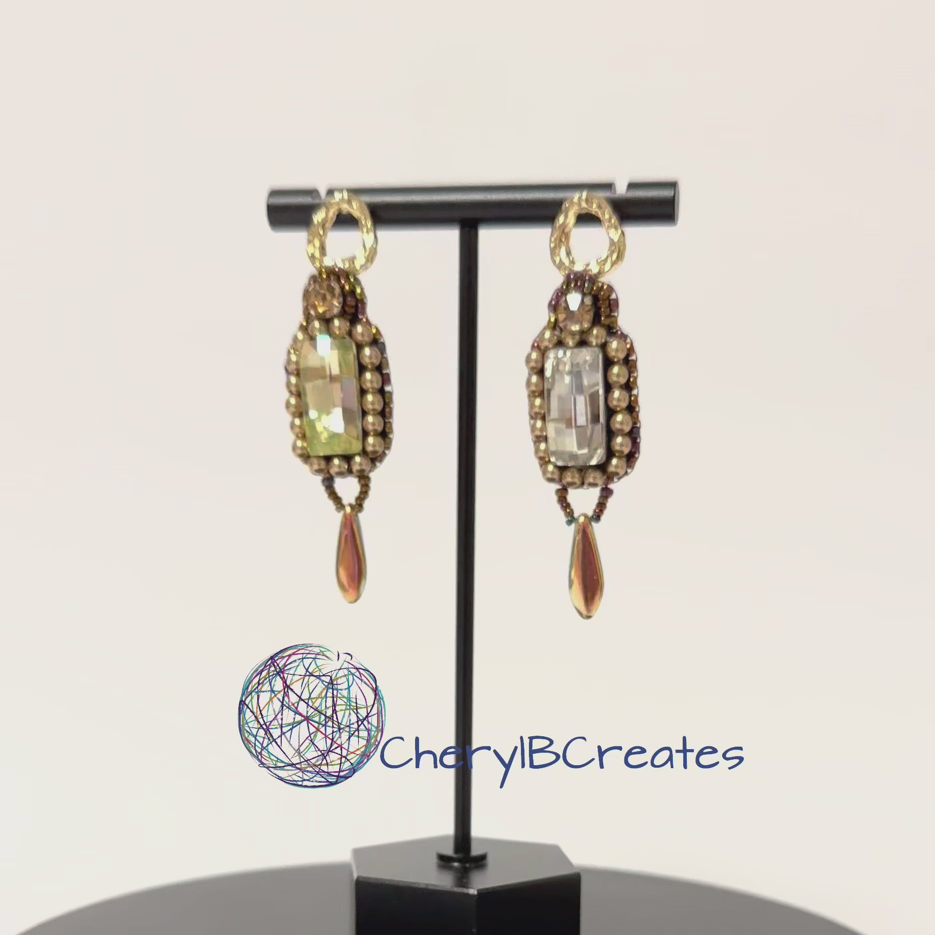 These handmade earrings feature a crystal baguette at the center. The crystal has a gold tone with a subtle green tint, and its multifaceted cut reflects light to create a luminous sparkle from every angle.