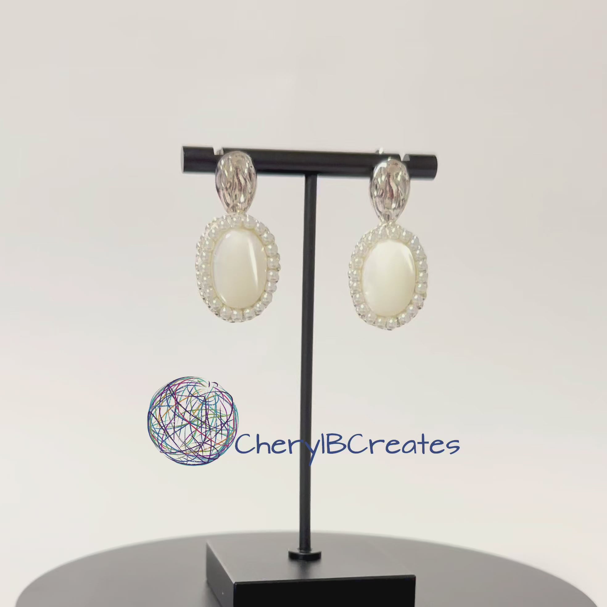 At the center of these earrings sits a smooth mother of pearl cabochon. It is framed with a delicate outline of small imitation pearls.
