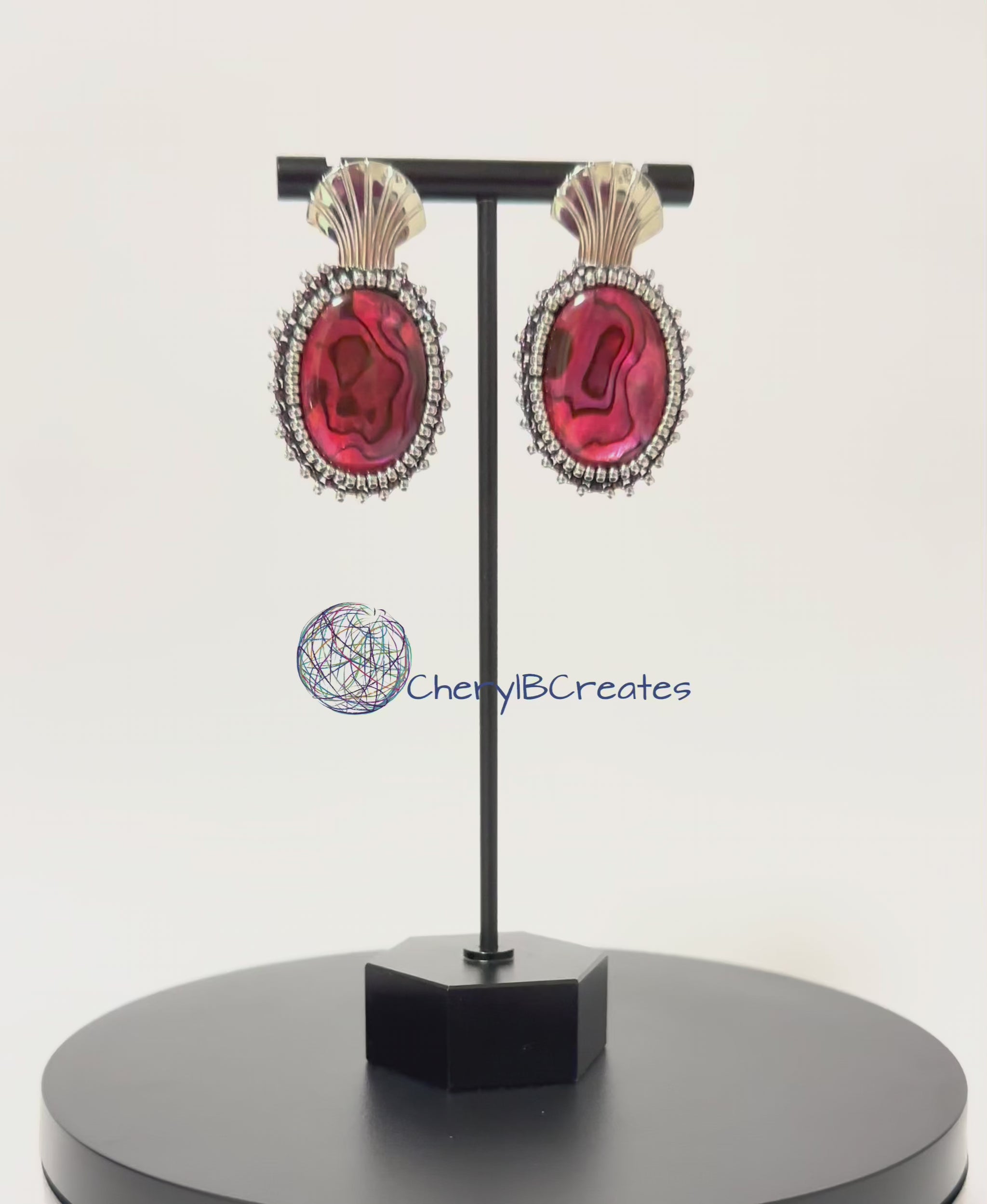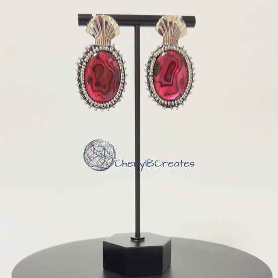 These earrings combine the natural shimmer of abalone with a lively burst of hot pink color. Each shell is framed with a line of silver colored beads.