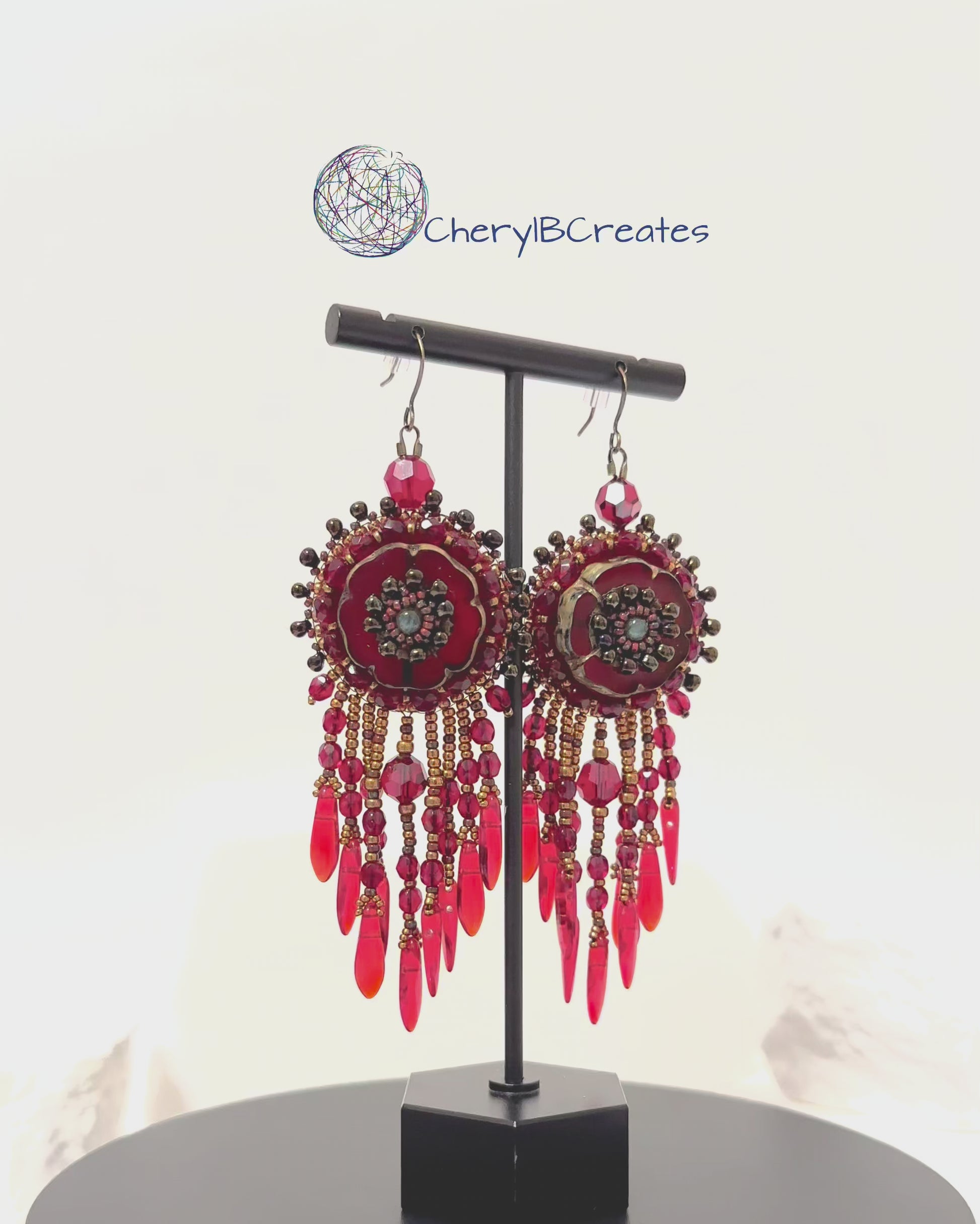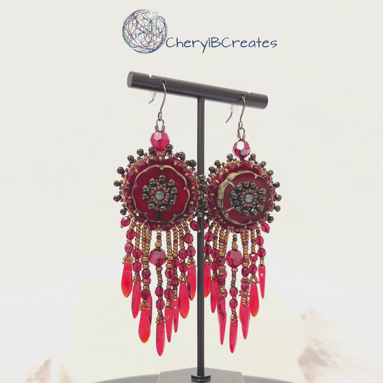 These handmade earrings feature vibrant pressed red glass flowers accented with hand beaded centers that add texture and detail to the design. Coordinating red beads form a flowing fringe beneath each flower, creating movement and a touch of sparkle that gives the earrings their statement presence.