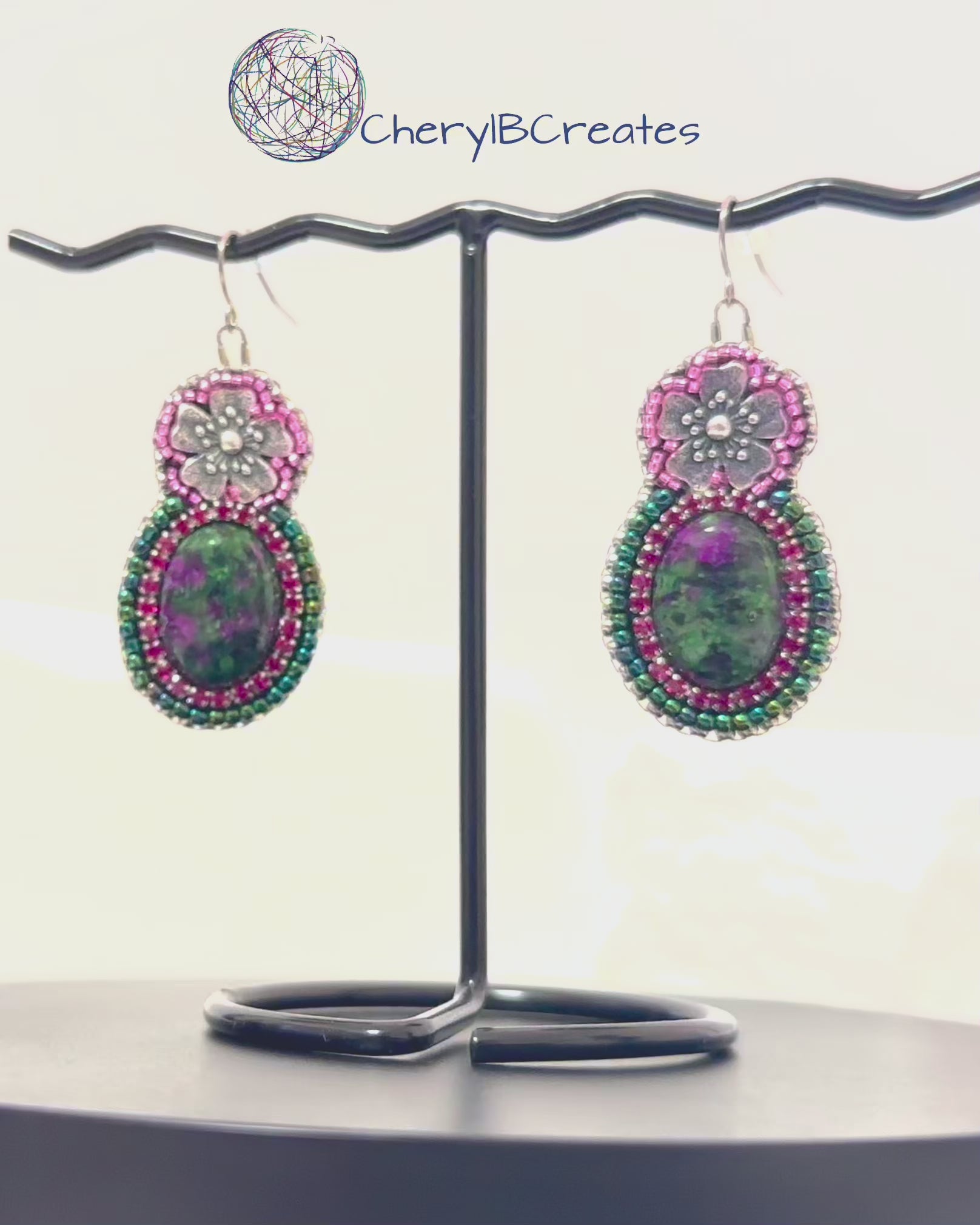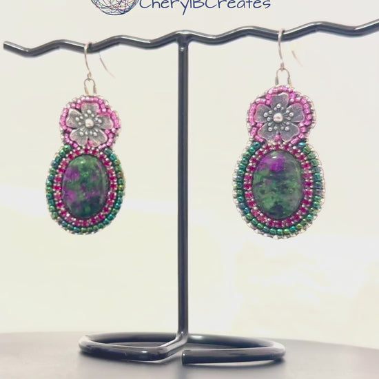 These hand beaded earrings highlight the natural beauty of ruby in zoisite cabochons. Each stone is framed with bright magenta rhinestone chain that adds a gentle sparkle and draws attention to the rich colors within the cabochon. A small metal cherry blossom rests above the stone, adding a light floral touch that brings a hint of spring to the design.