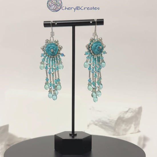 These handmade earrings feature carved mountain jade flowers in a turquoise tone. Mountain jade is a trade name often used for dyed dolomite or marble that is cut and polished.