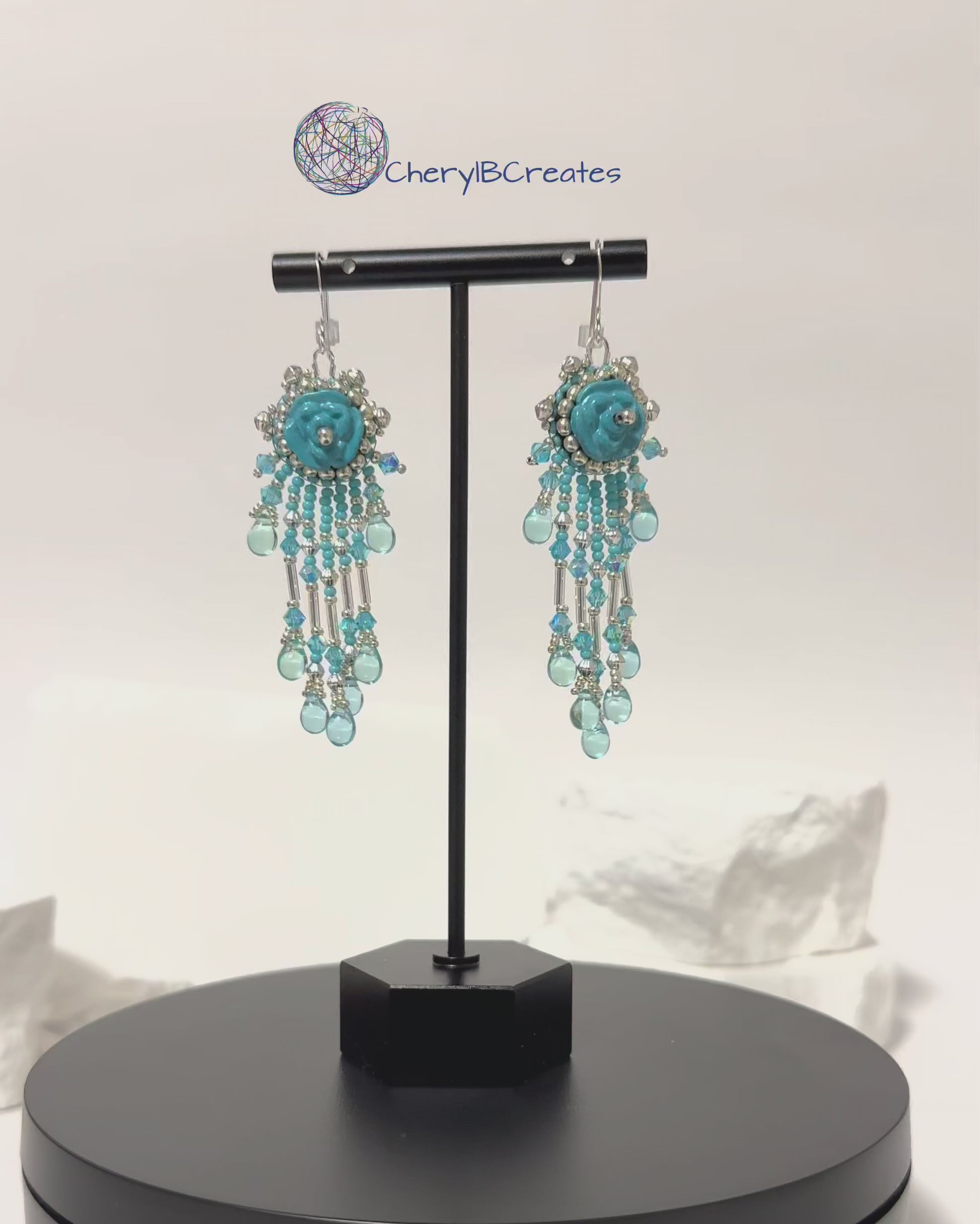 The stone is carved into a rose shape and accented with a row of beads that frame the flower and add a bit of texture to the design. The fringe makes them eye-catching.