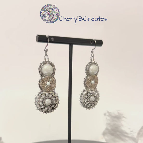 These hand beaded earrings feature a layered design that highlights a white pearl color throughout. A glass cabochon tops two different metal components with white centers.
